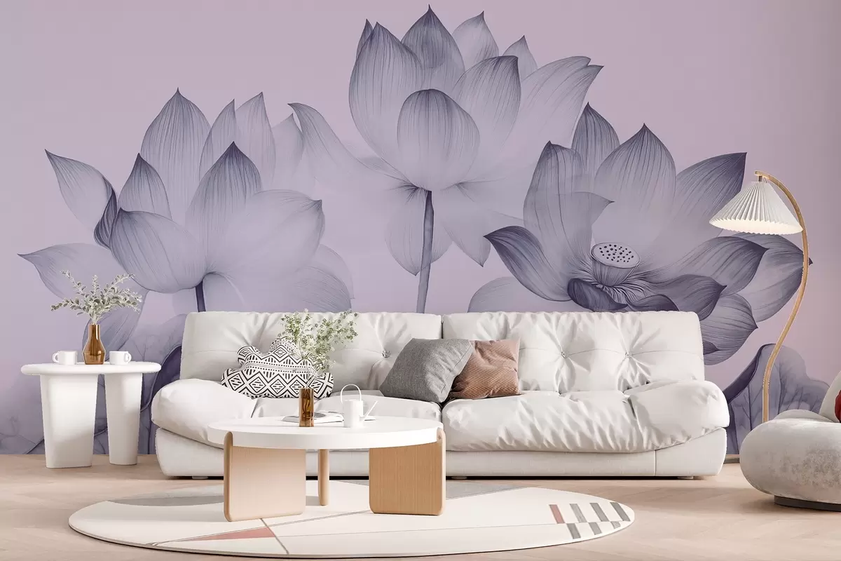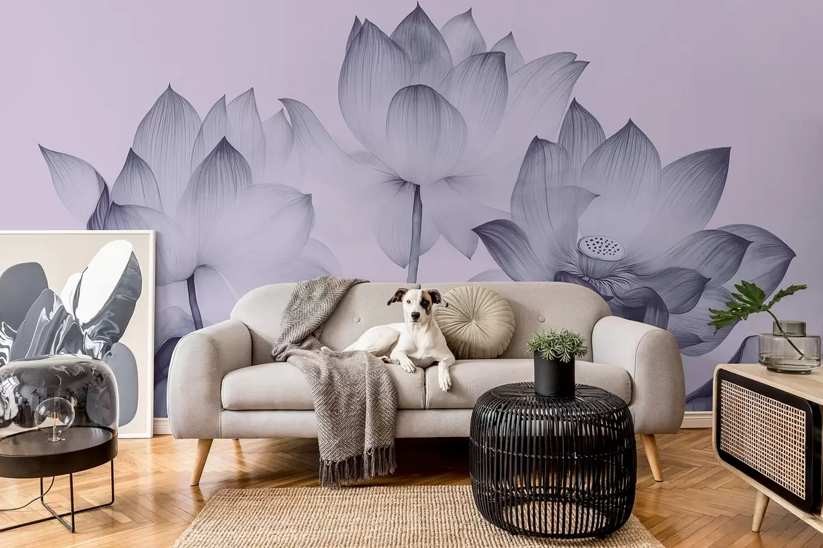 Fotomurales Tres lotos con hojas al estilo de la pintura china en color azul Nr. w02146v2
