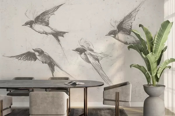 murales de pared Pájaros voladores, dibujo a tinta, minimalismo, colores grises w02155