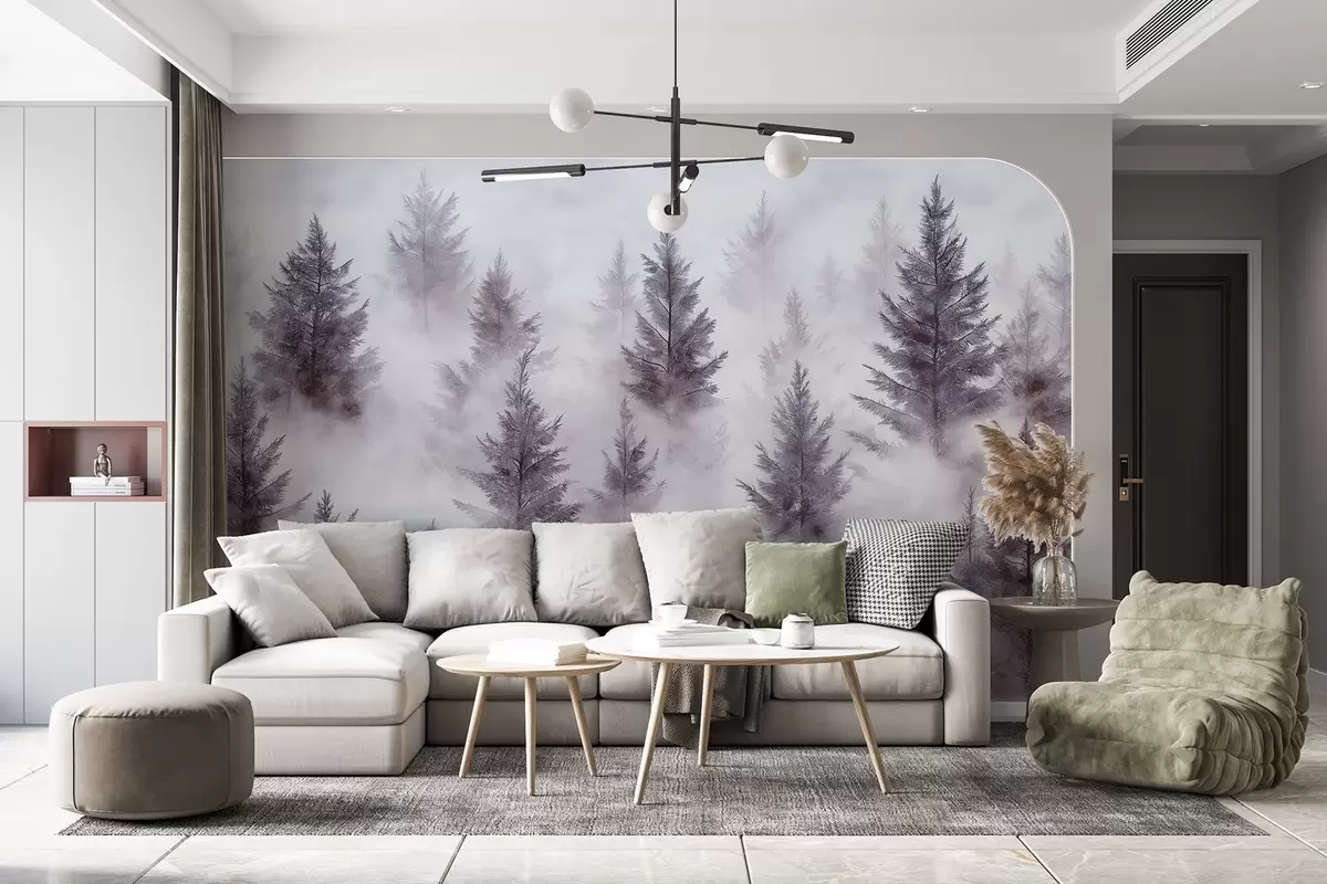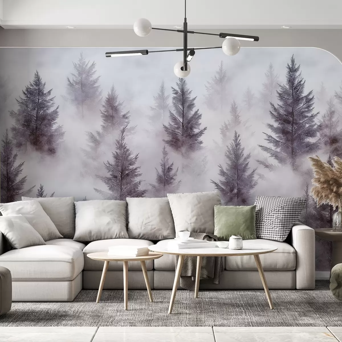 Fotomurales Hermoso bosque con pinos, niebla, paisajes de naturaleza, colores púrpura Nr. w02222v1