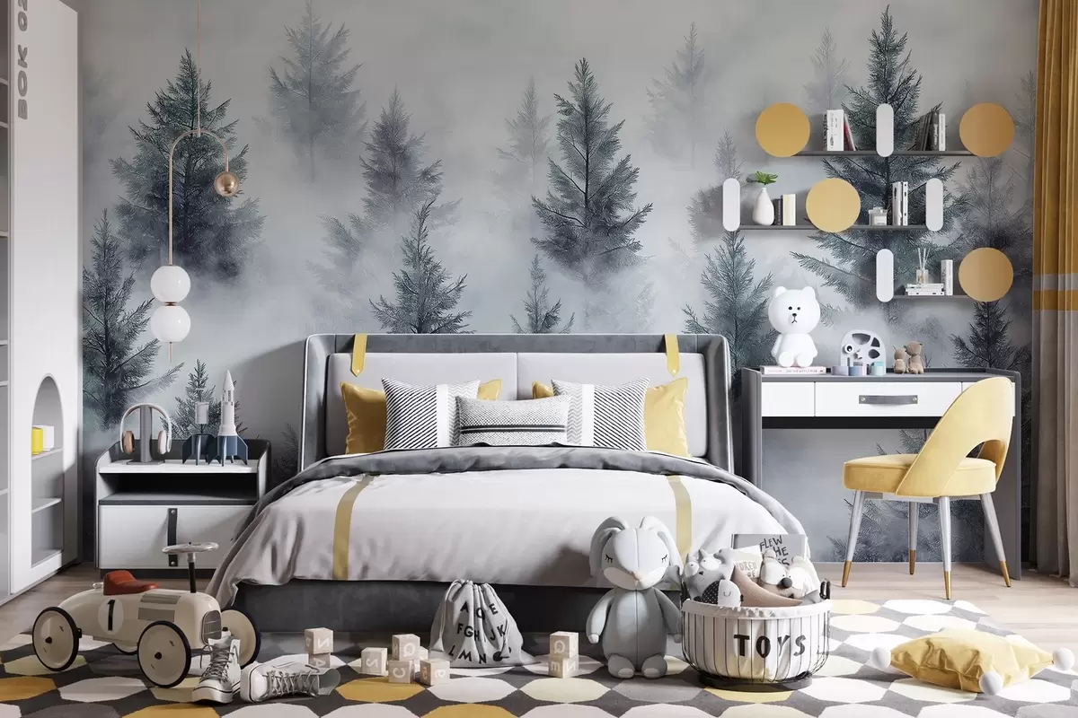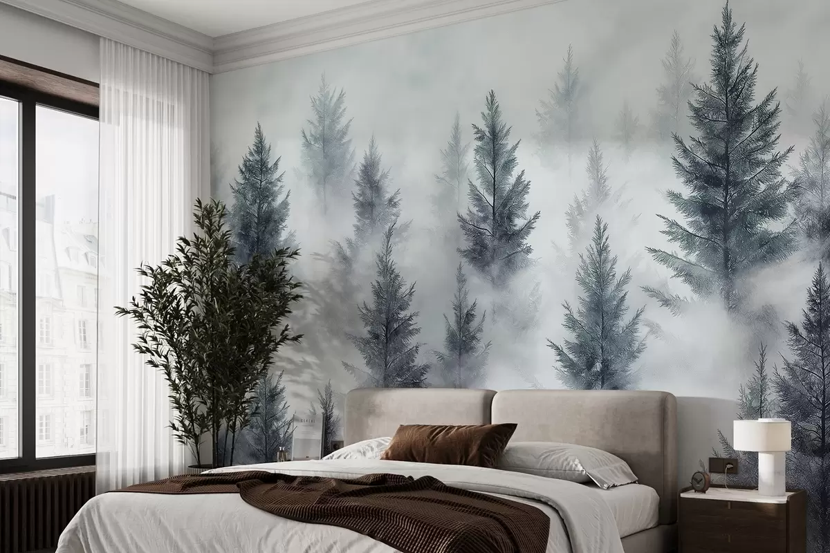 Fotomurales Hermoso bosque con pinos, niebla, paisajes de naturaleza, colores grises Nr. w02222v2