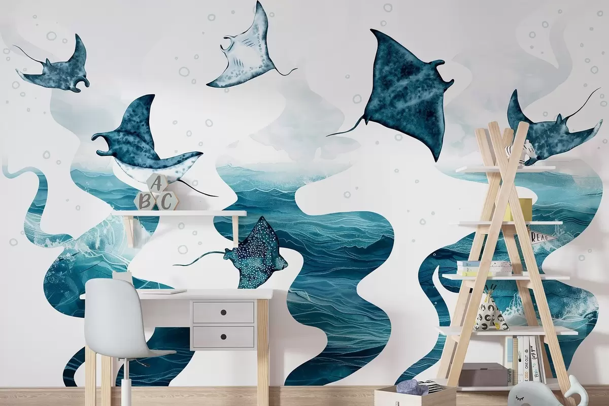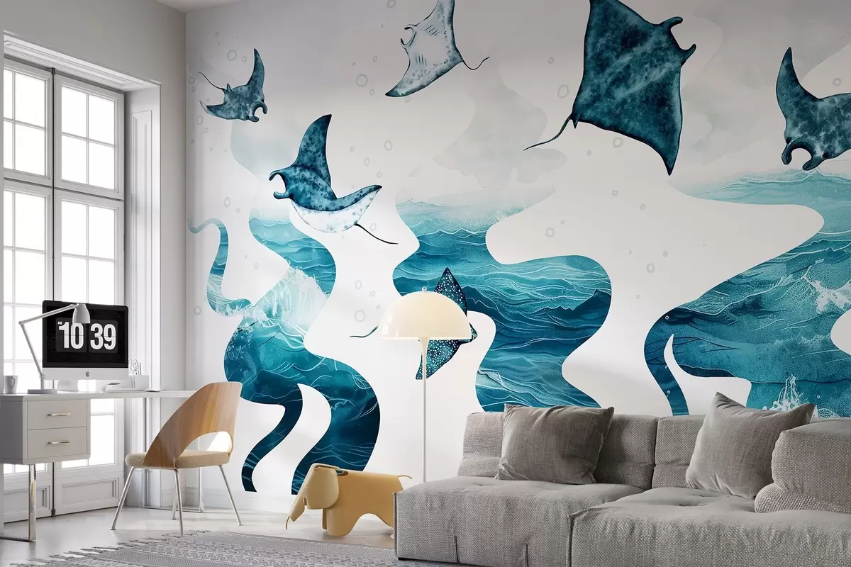 Fotomurales Pez manta raya, estilo acuarela, mar, océano, colores azules Nr. w02266