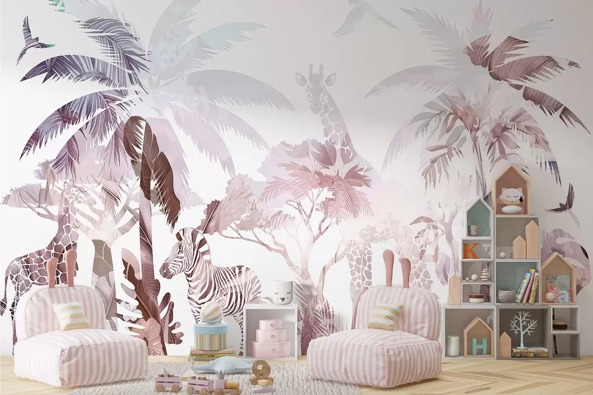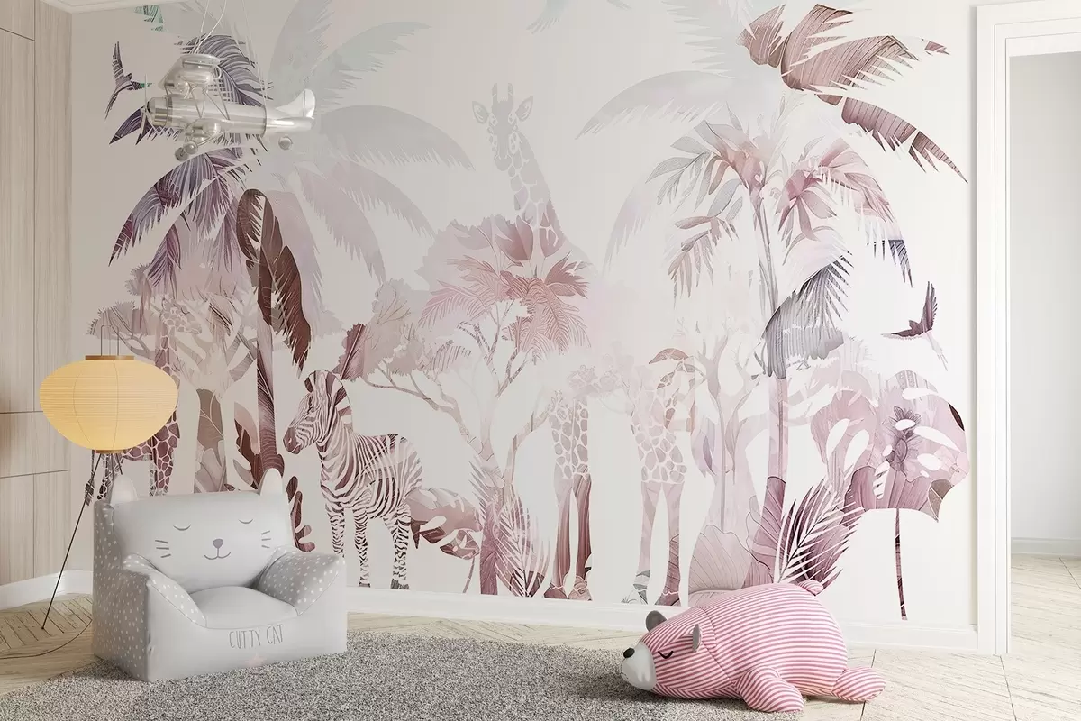 Fotomurales Animales de safari, palmeras, selvas, cebra, jirafa, colores rosa suave Nr. w02267v1