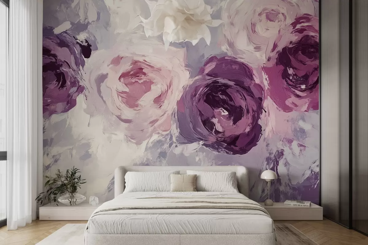Fotomurales El papel pintado es una imitación de la pintura al óleo, con grandes flores de rosa difuminadas en tonos pastel. Nr. w02288