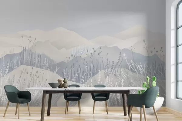 Fotomurales Montañas neblinosas y campos de hierba y flores en tonos azules Nr. w02317v1