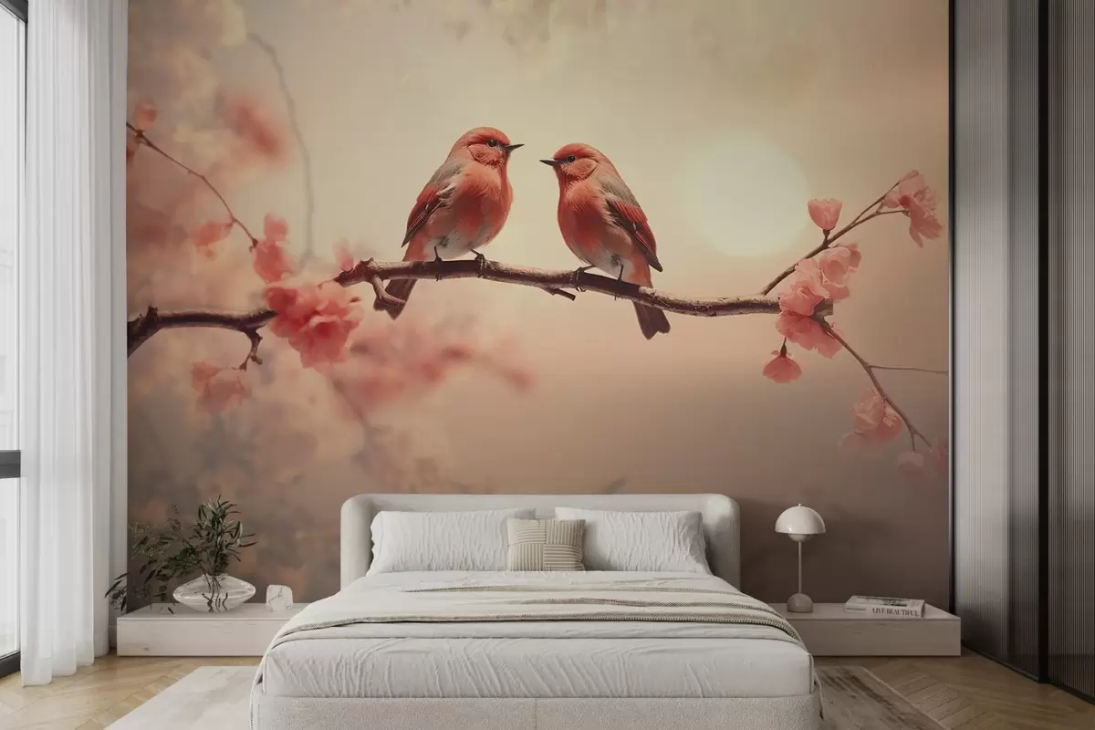 Fotomurales Una escena serena y romántica con dos pajaritos sentados en una delicada rama decorada con flores de color rosa pálido. Nr. w02343