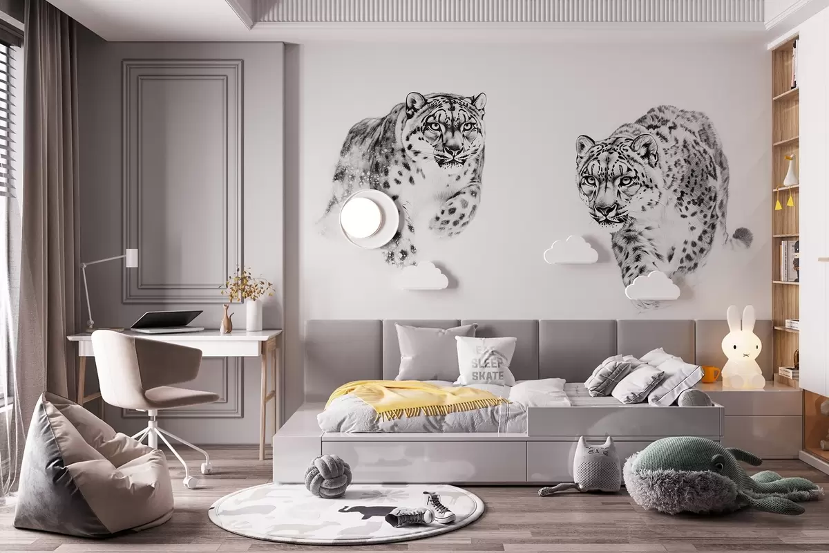 Fotomurales Leopardos de las nieves, invierno, animales salvajes, dibujo a lápiz, minimalismo Nr. w02359
