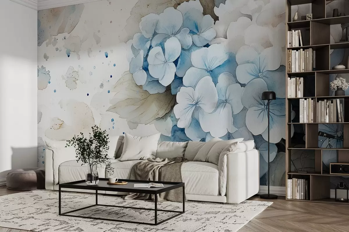Fotomurales Acuarela estilo de dibujo de flores de hortensia con hojas, colores naturales suaves Nr. w02493