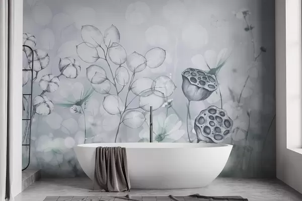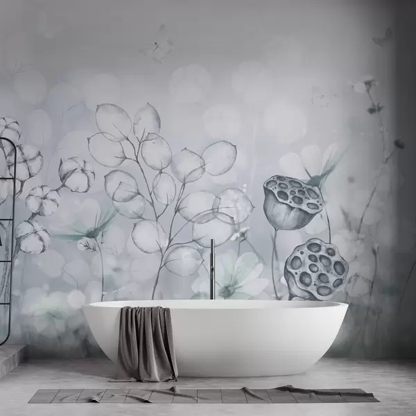 Fotomurales Jardín de flores de ensueño, mariposa, flores de algodón, lotos, colores grises Nr. w02516v2