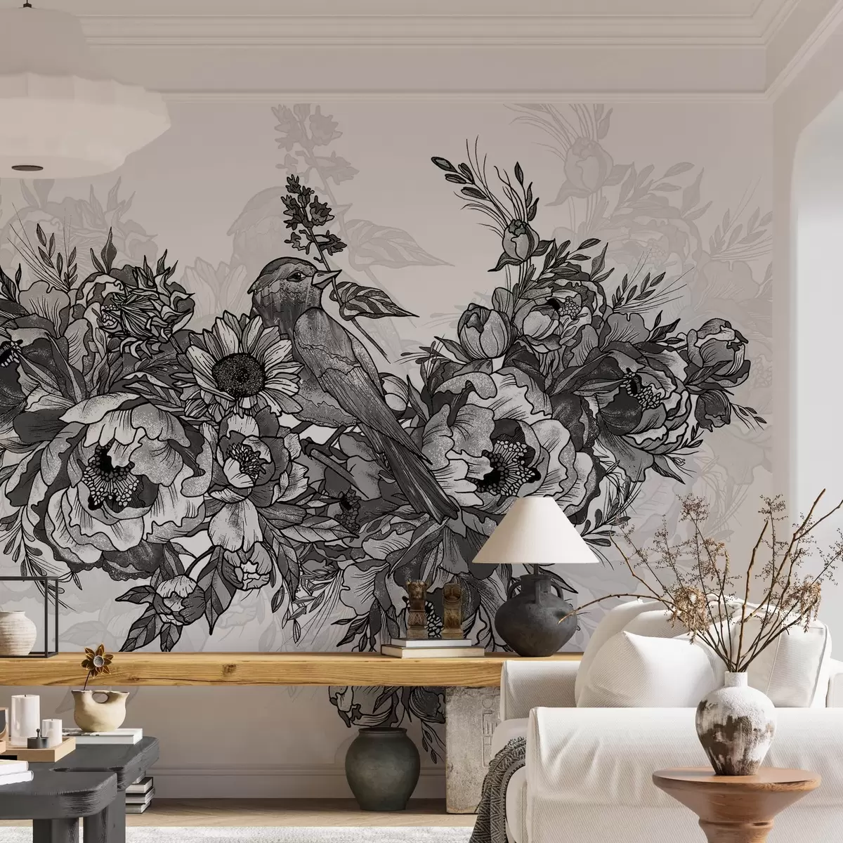 Fotomurales Composición monocroma de flores y pájaros Nr. w02834