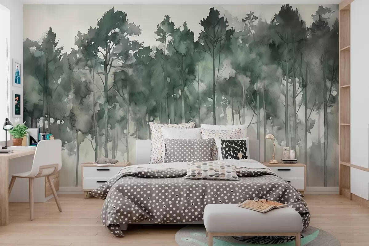 Fotomurales Bosque estilo acuarela, pinos, paisaje natural, colores verdes Nr. w02937