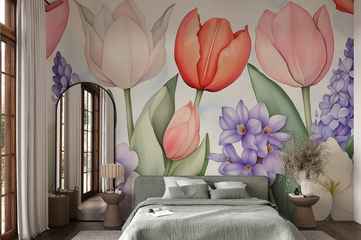 Fotomurales Flores de primavera, tulipanes, jacintos, dibujo estilo acuarela, floral Nr. w02940