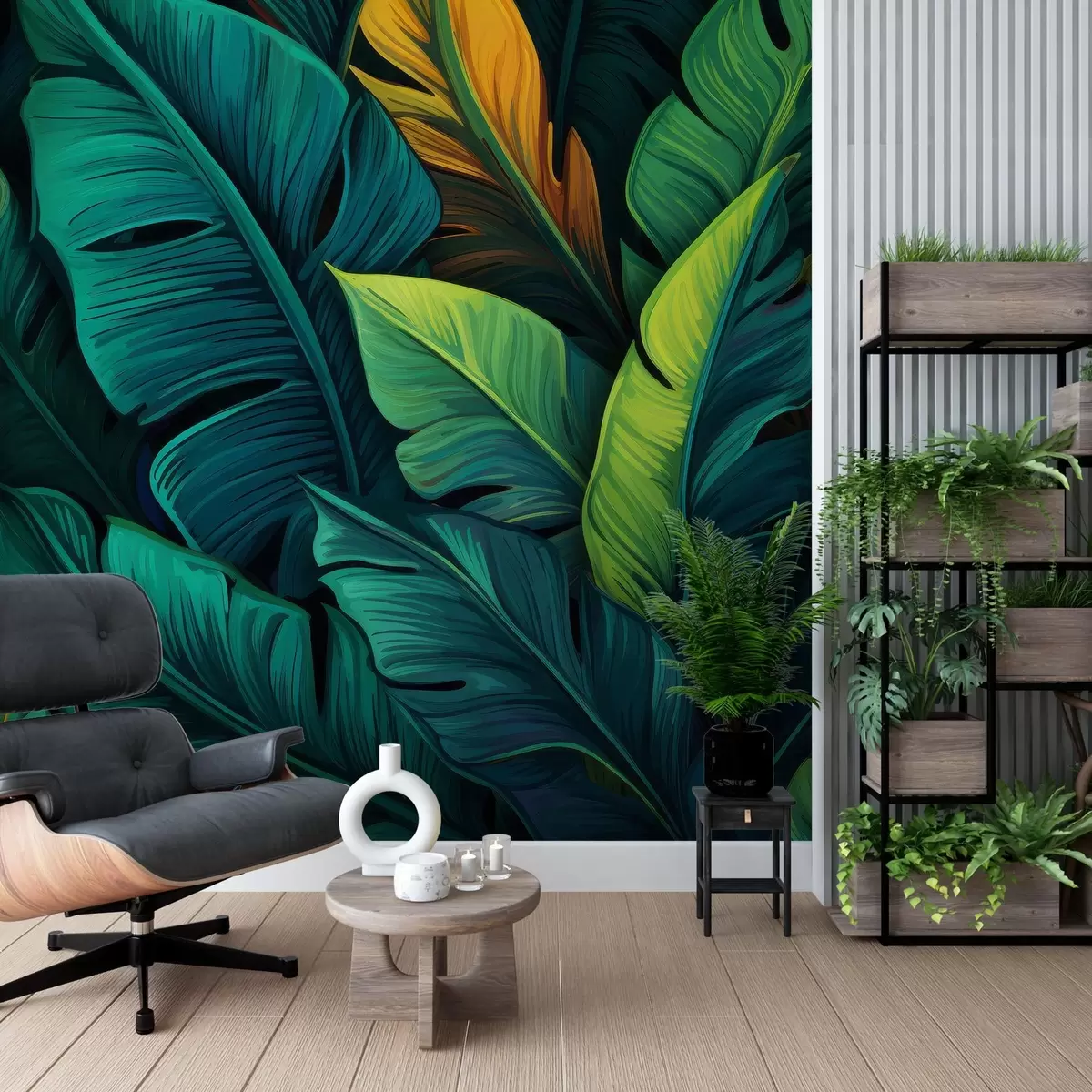 Fotomurales Hojas tropicales vibrantes con tonalidades verde intenso, azuladas y anaranjadas Nr. w03078