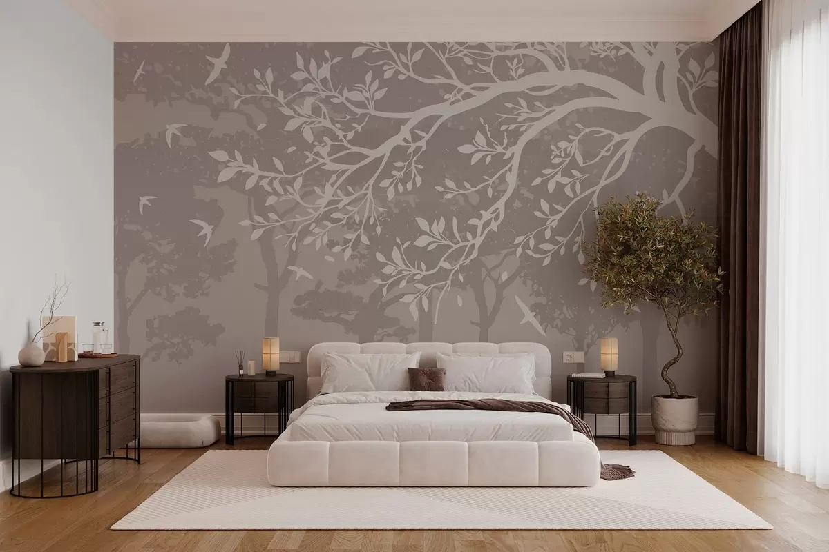 Fotomurales silueta de una rama de árbol cremosa con pájaros, sobre el fondo del bosque Nr. w03116
