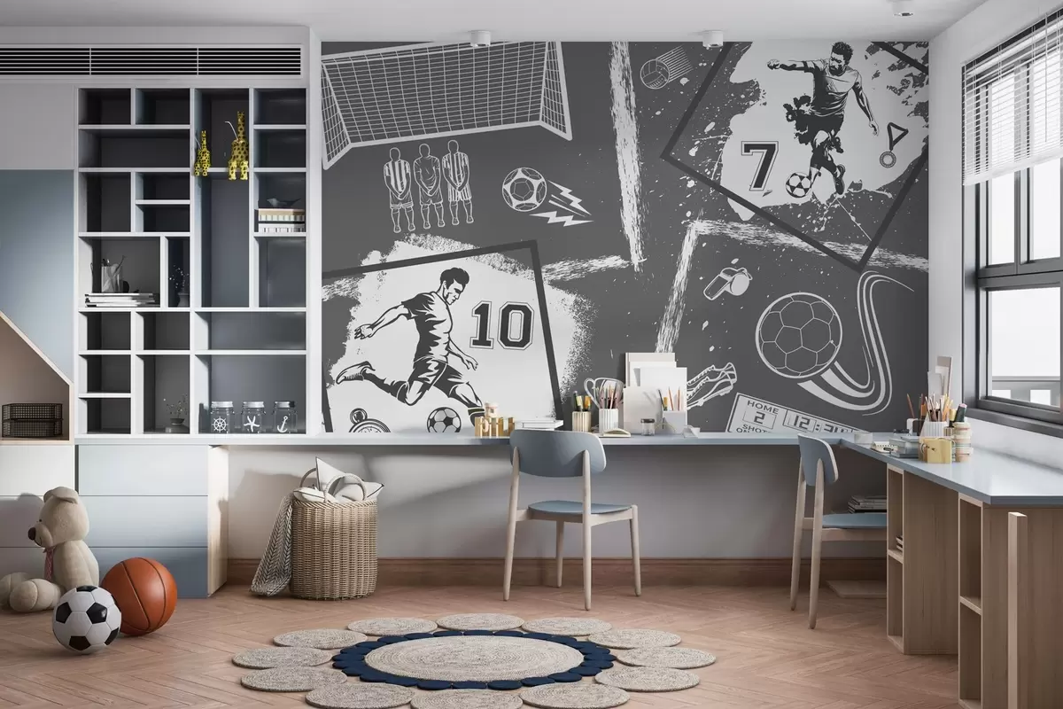 Fotomurales Jugadores de fútbol, balón y otros atributos futbolísticos en tonos grises Nr. w03122v1