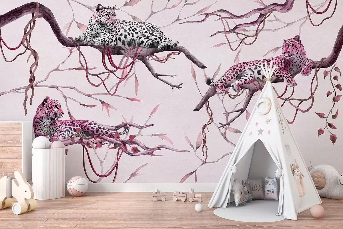 Fotomurales Leopardos en los árboles de la selva, lianas, tropical, animales salvajes, paleta de color rosa Nr. w03146v2
