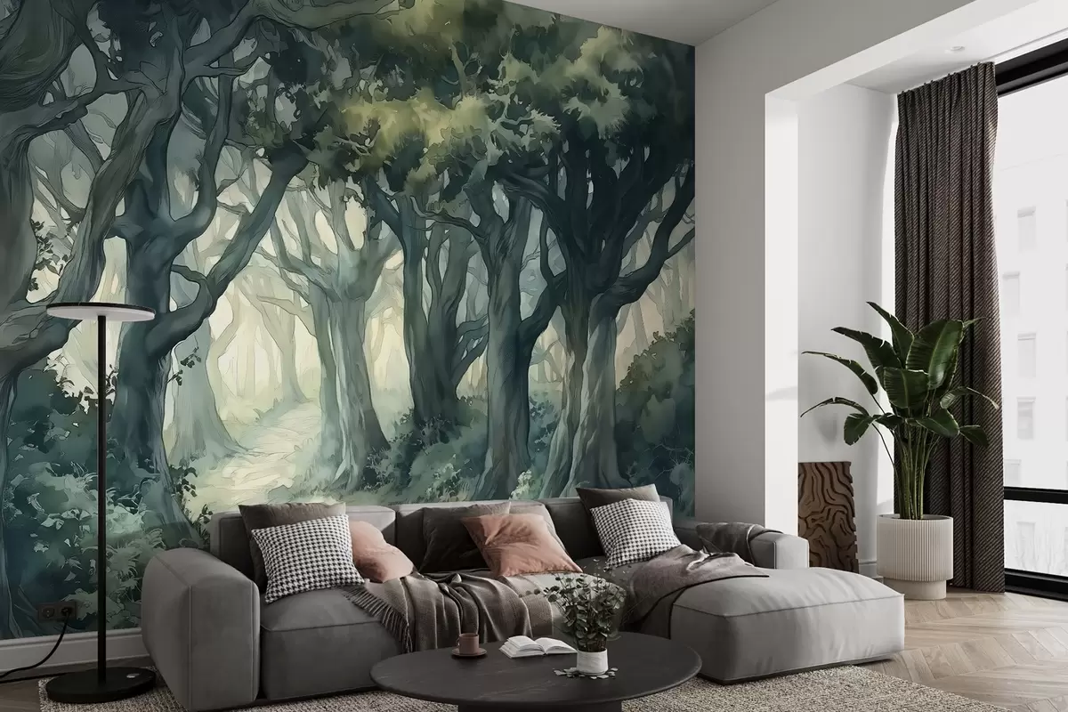 Fotomurales Bosque con árboles grandes, spallete color verde, dibujo estilo acuarela Nr. w03150