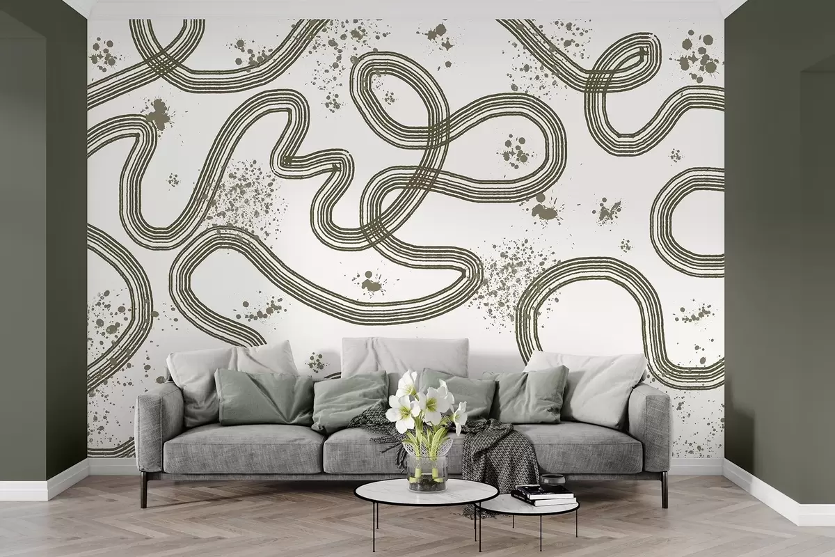 Fotomurales Dibujo lineal, salpicaduras de pintura, minimalismo, color oliva Nr. w03408