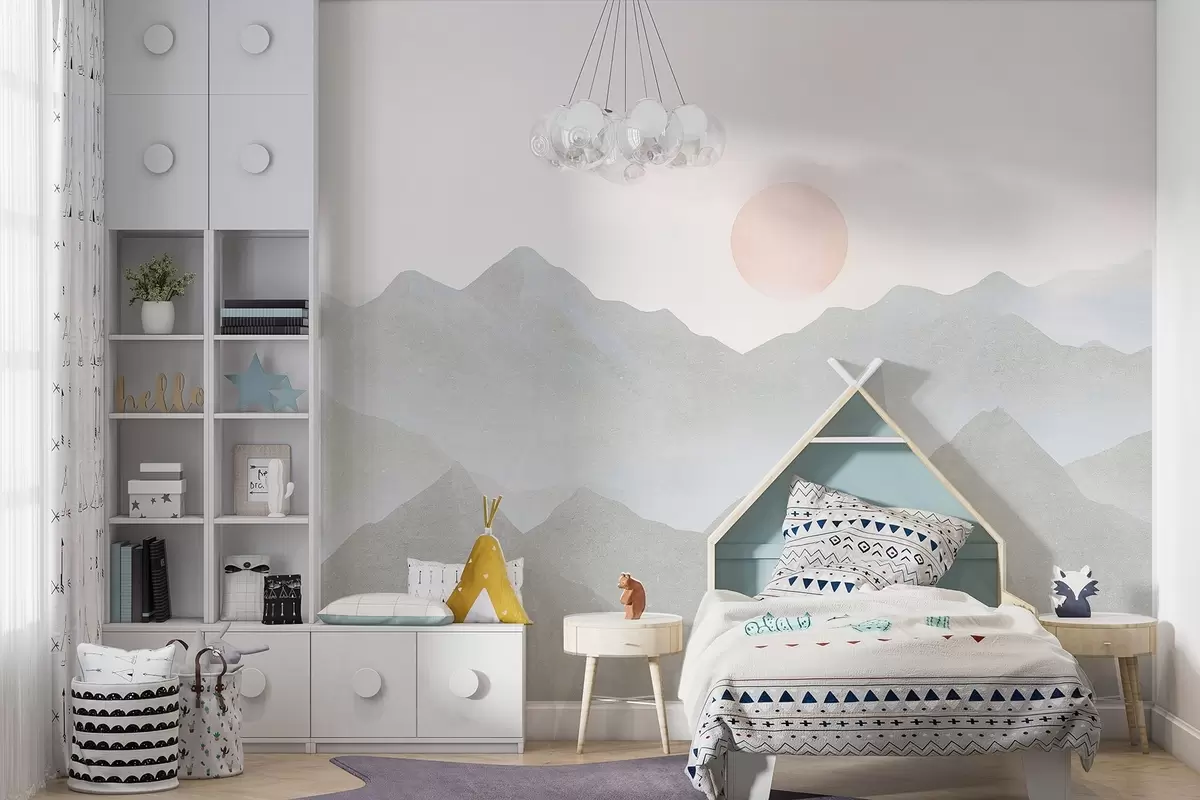 Fotomurales Paisaje de montaña estilo boho, puesta de sol, pastel suave, gris Nr. w03547v1