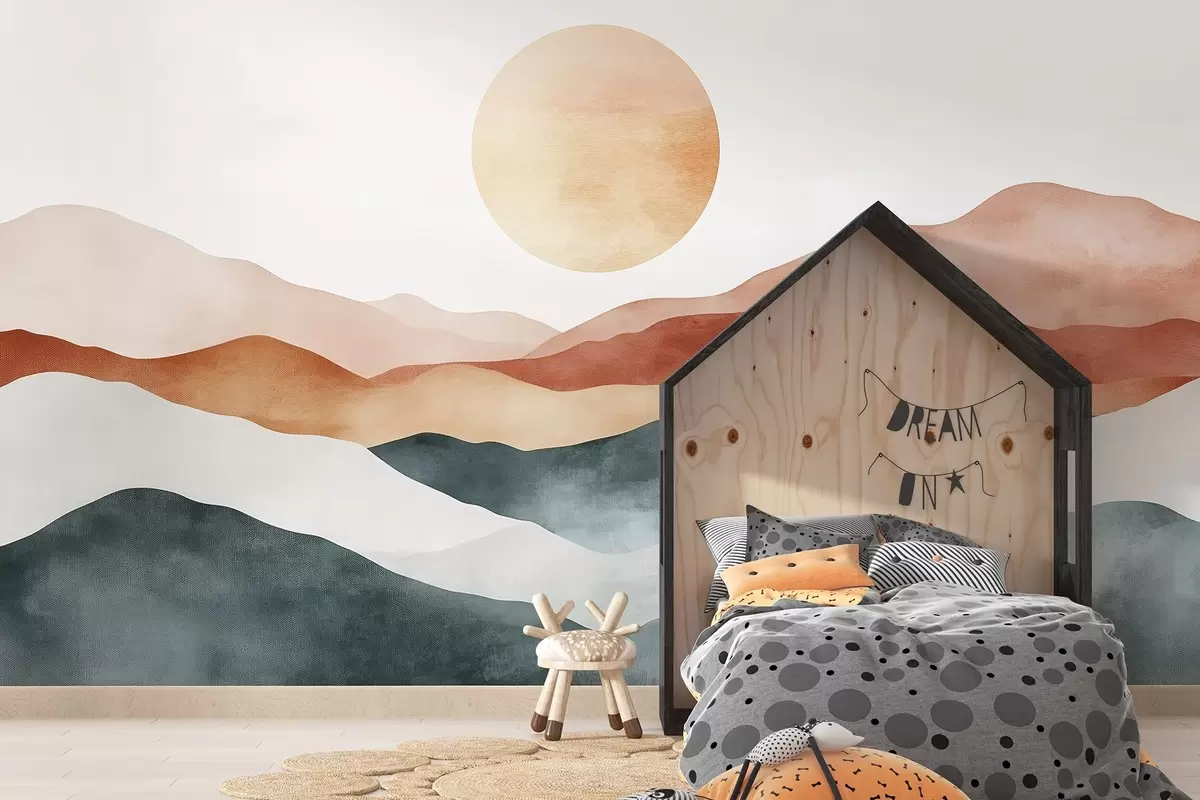 Fotomurales Acuarela montañas con el Sol, estilo boho, rojo, naranja, gris Nr. w03551