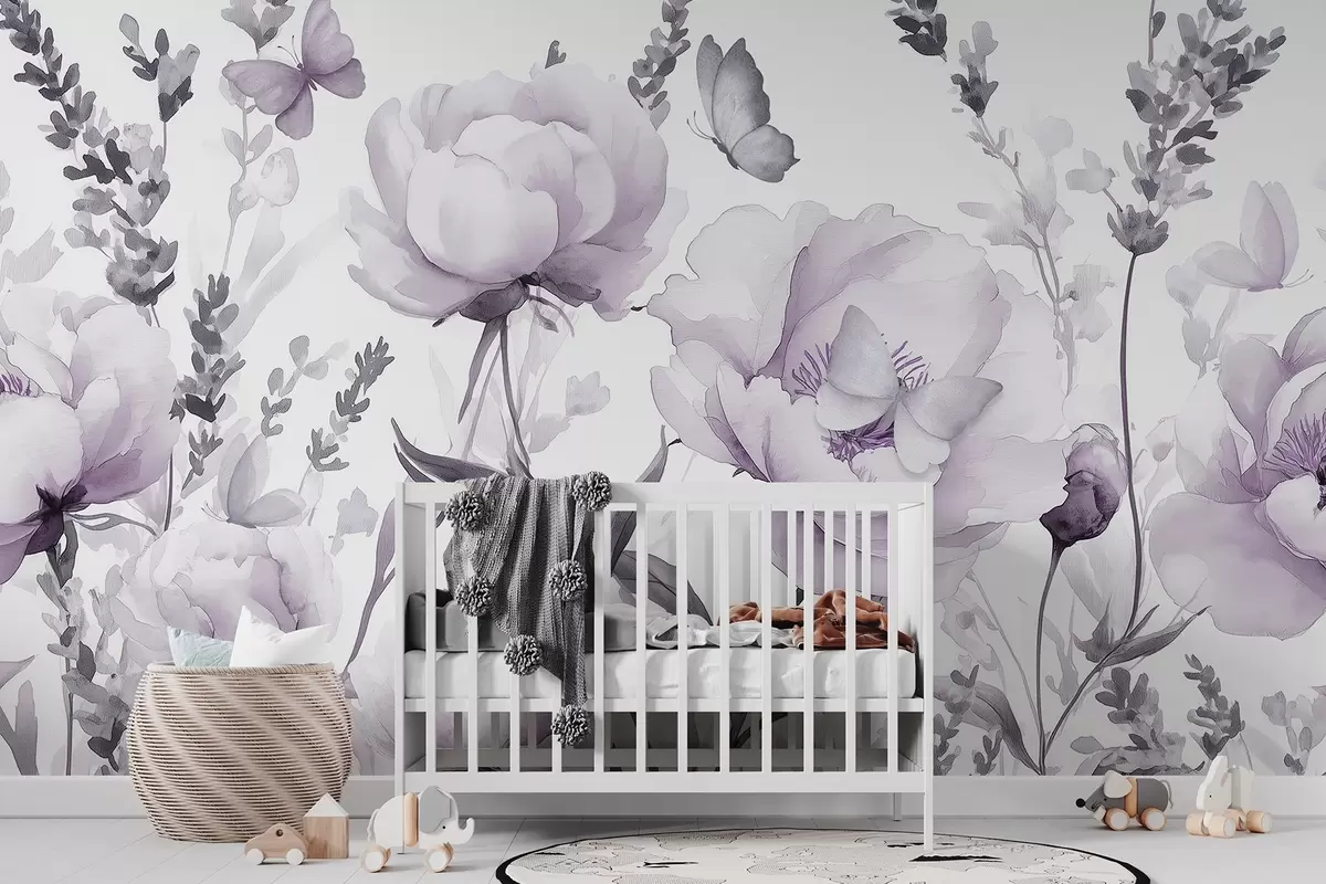 Fotomurales Pradera de flores, peonías, lavanda, mariposas, estilo acuarela, colores de pupas Nr. w03668v3