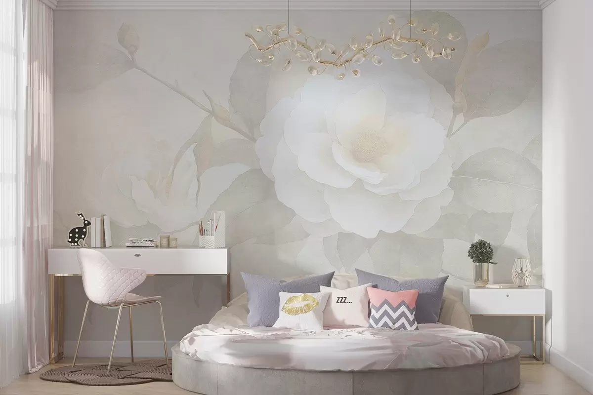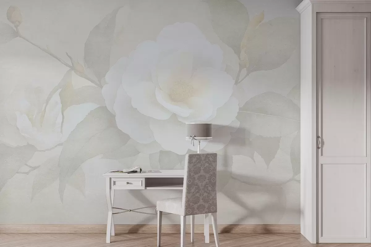 Fotomurales Pastel suave con flores de camelia en la rama, colores beige Nr. w03760