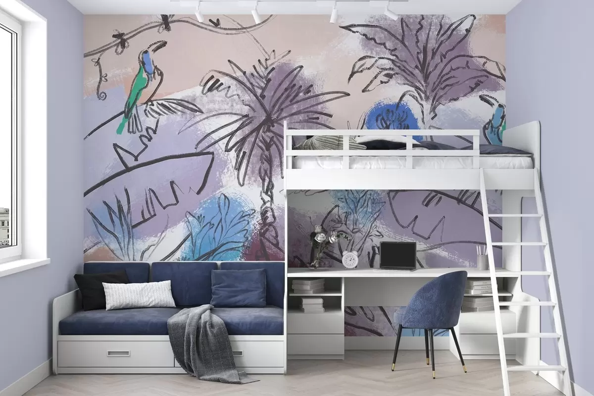 Fotomurales Estampado tropical con flores azules y pintorescos loros Nr. w04019v2