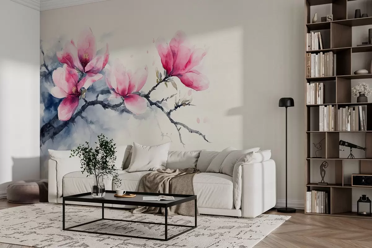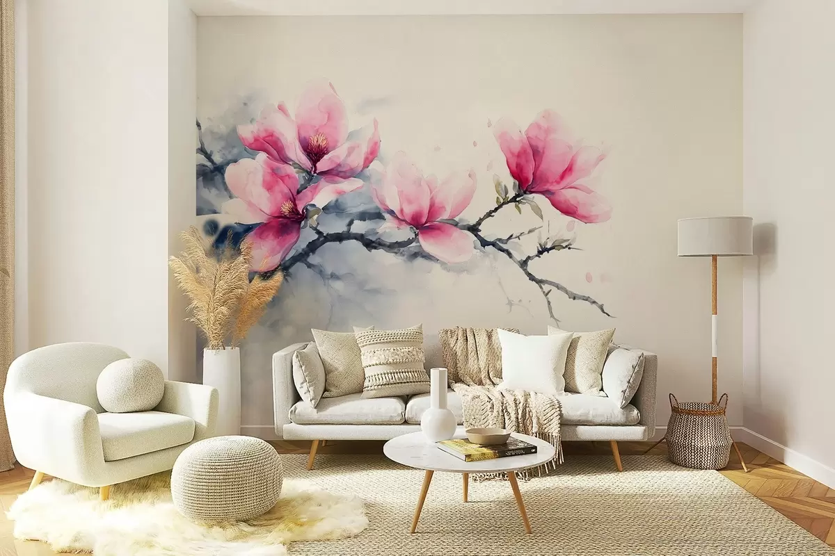 Fotomurales rama floreciente de magnolia rosa sobre fondo marfil Nr. w04027
