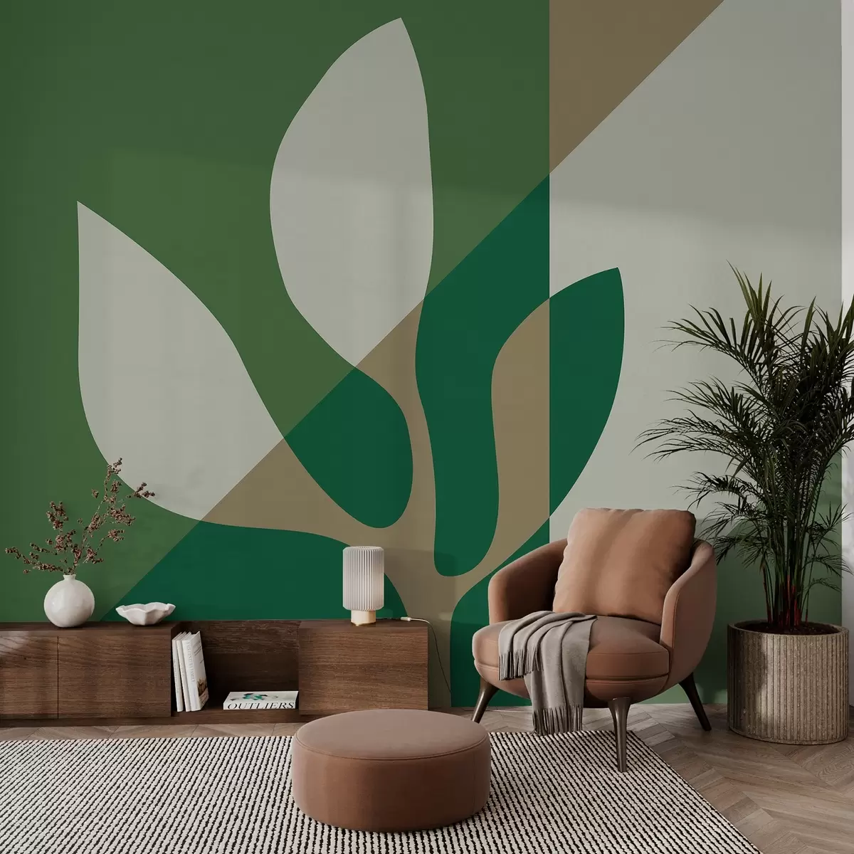 Fotomurales planta gráfico abstracto sobre el fondo de la geometría en colores verde y ocre Nr. w04028
