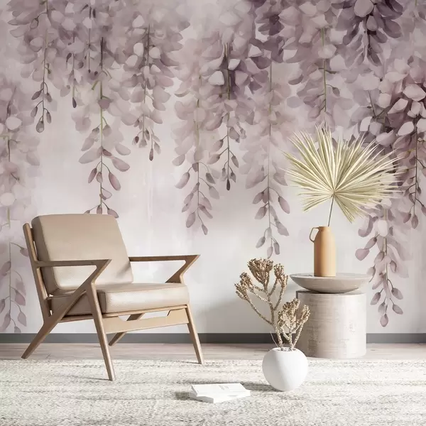 Fotomurales Suave escena de acuarela en tonos rosa cremoso, con racimos de glicinas en cascada formando una cortina floral de ensueño Nr. w04034v2