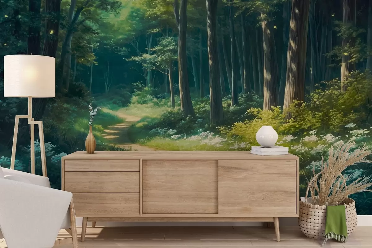Fotomurales Bosque verde con suave luz solar, árboles y flores blancas, dibujo al óleo Nr. w04118