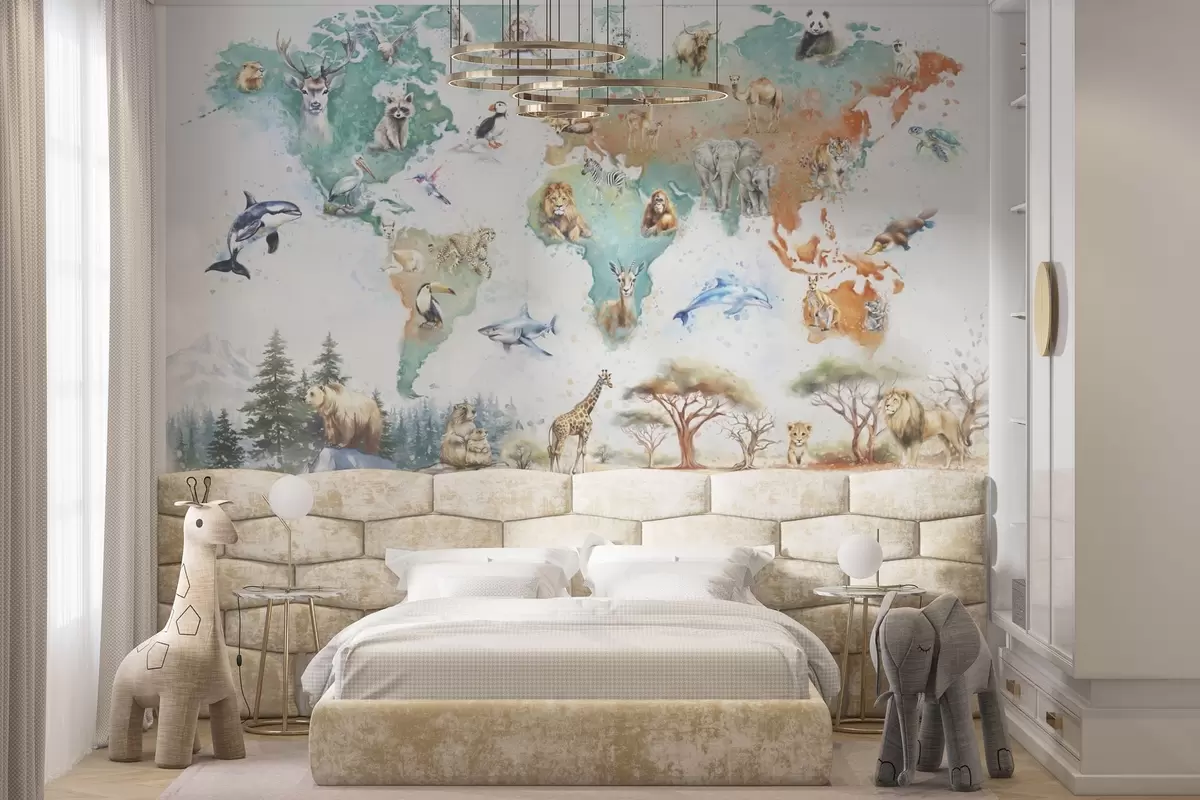 Fotomurales Mapamundi con animales, estilo de ilustración educativa infantil Nr. w04148