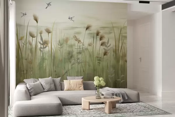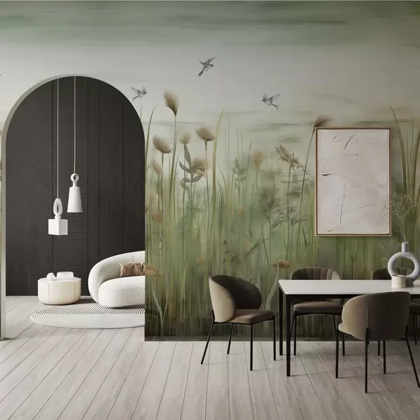 Fotomurales Paisaje de hierba con golondrinas en un cielo suave Nr. w04258v1