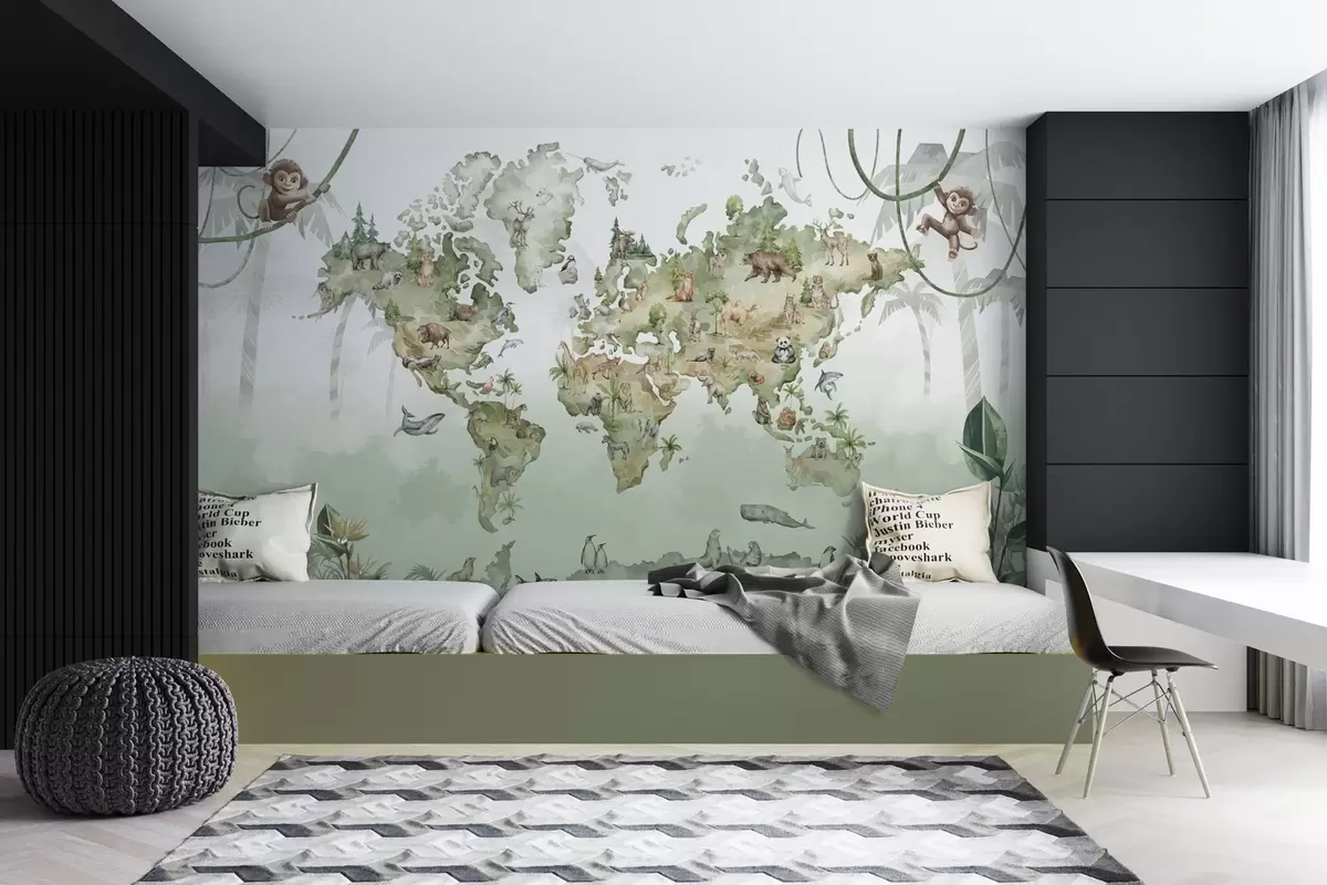 Fotomurales Mapamundi en acuarela con animales Nr. w04418