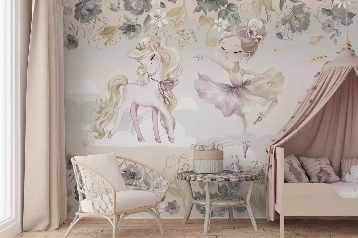 Fotomurales Poni blanco como la nieve y bailarina entre flores y nubes Nr. w04419
