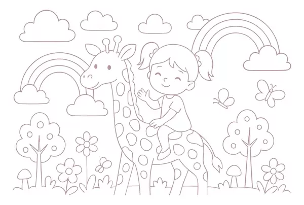 Fotomurales pintura en polvo de una niña sobre una jirafa al estilo de un libro para colorear infantil Nr. w04753v1
