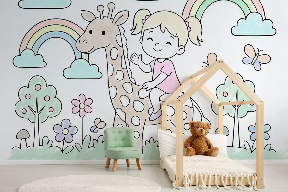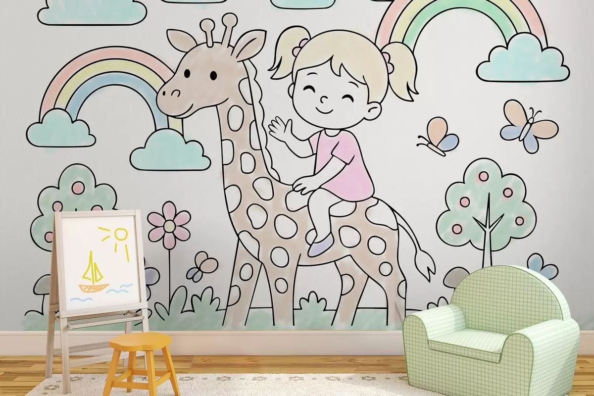 Fotomurales niña sobre una jirafa al estilo de un libro para colorear infantil Nr. w04755