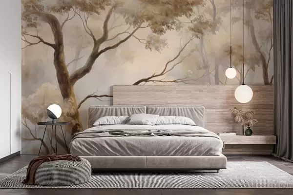 Fotomurales El bosque envuelto en la ligera niebla matinal. Una delicada pintura atmosférica al estilo de un paisaje artístico Nr. w04817