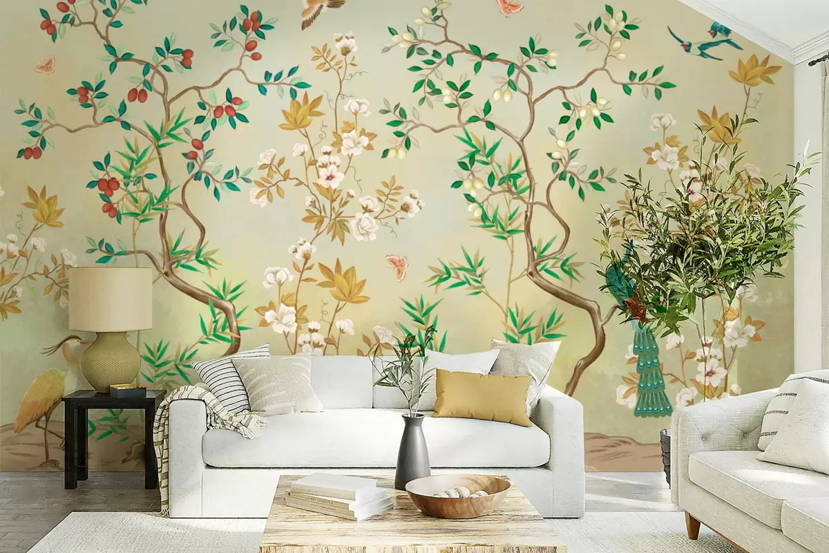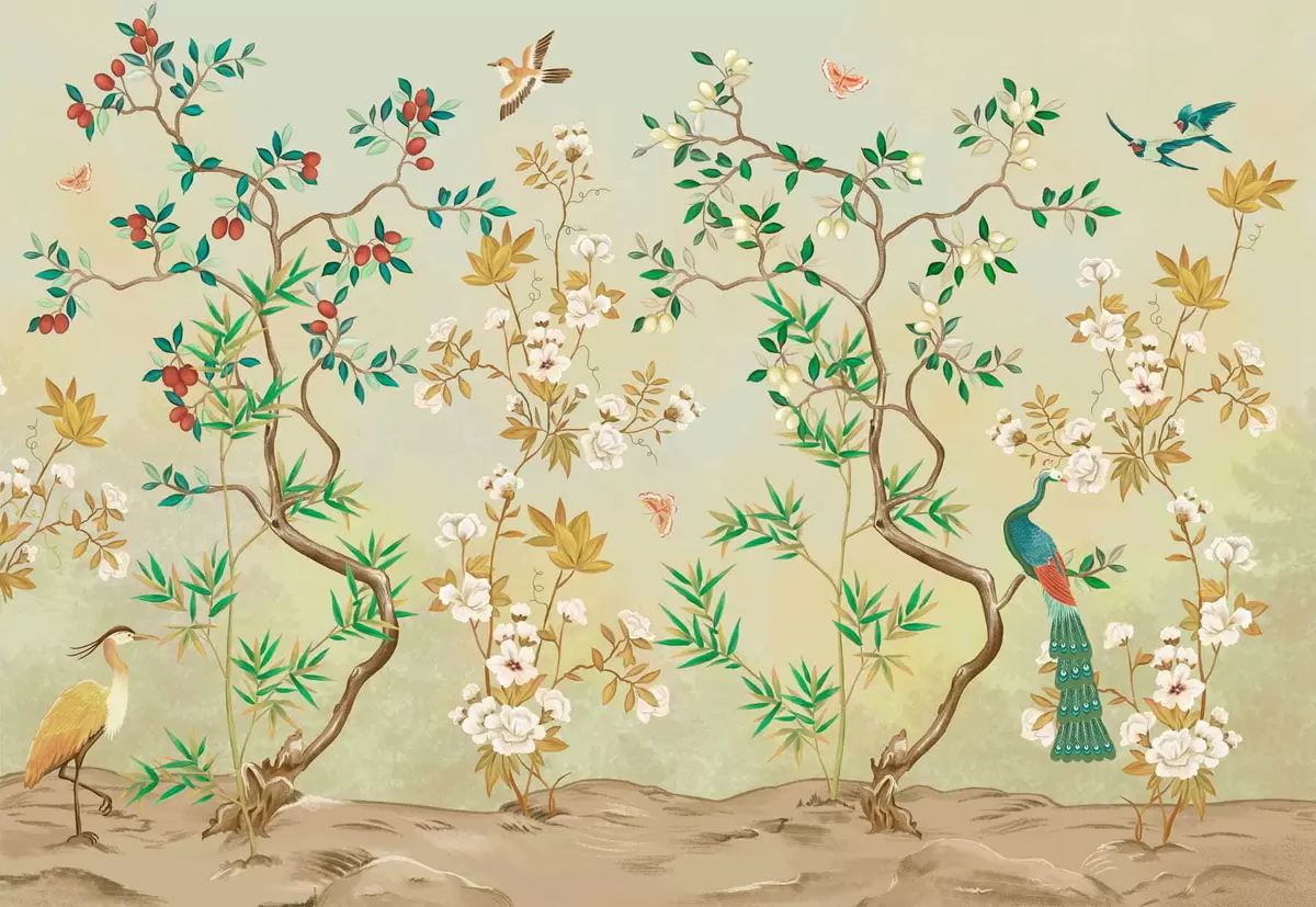 Fotomurales Escena con árboles, flores y pájaros, fondo claro. Nr. w05004v1