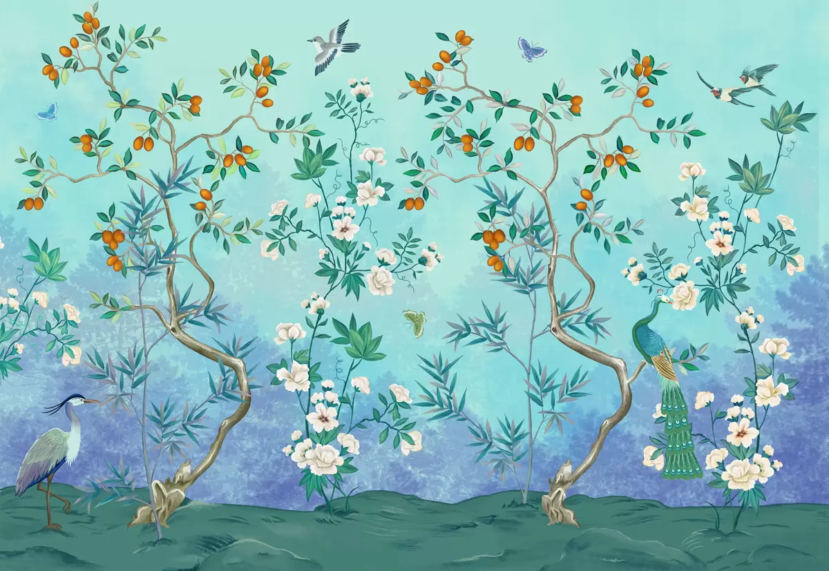Fotomurales Escena con árboles, flores y pájaros, fondo azul Nr. w05004v2