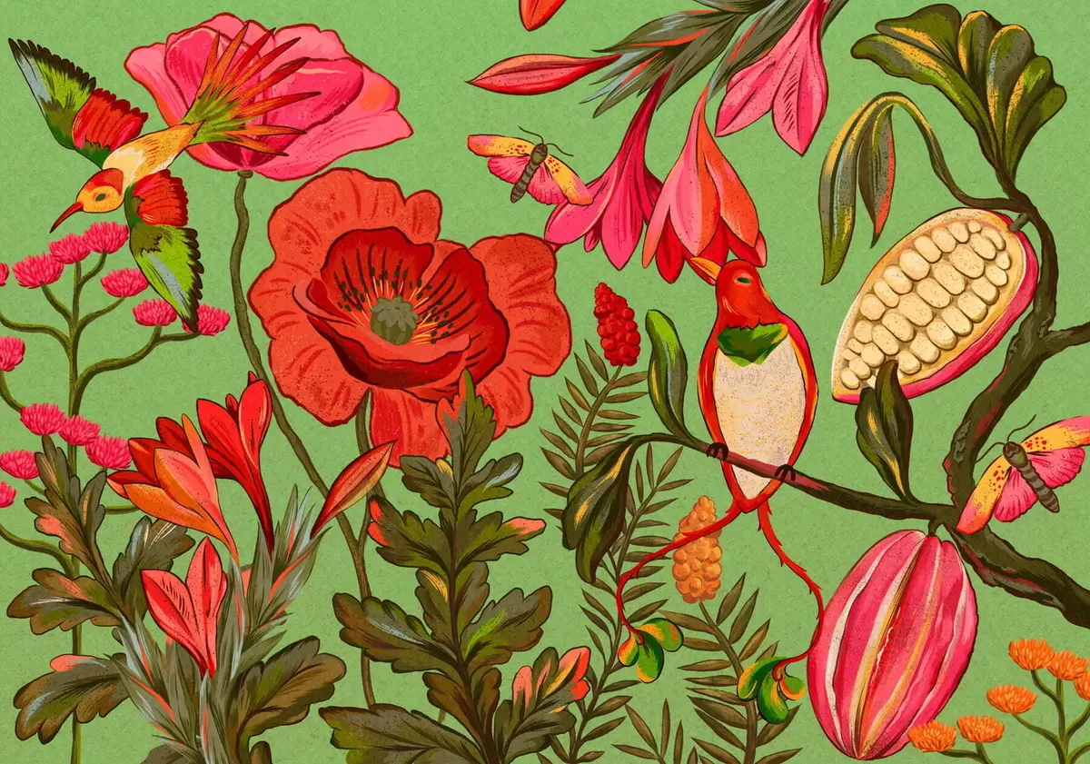 Fotomurales Flores y pájaros decorativos sobre fondo verde Nr. w05036v1