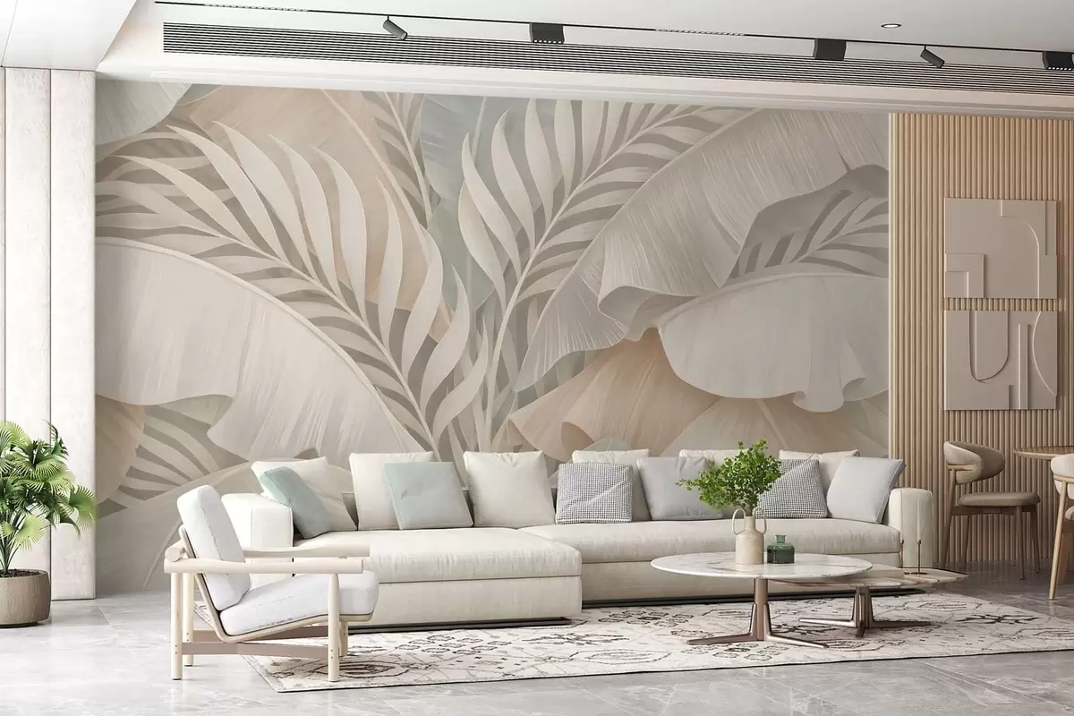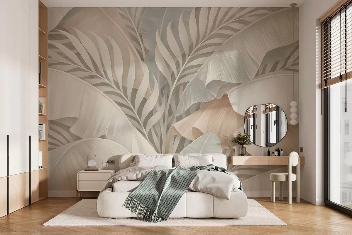 Fotomurales Grandes hojas tropicales en tonos melocotón y turquesa apagado. Nr. w05062