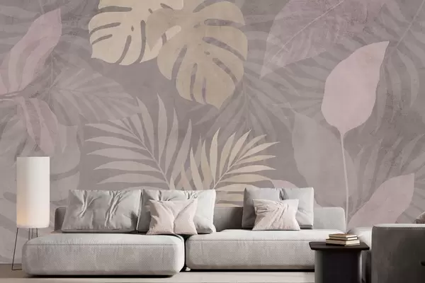 Fotomurales Hojas tropicales con textura sobre fondo gris. Nr. w05063v1