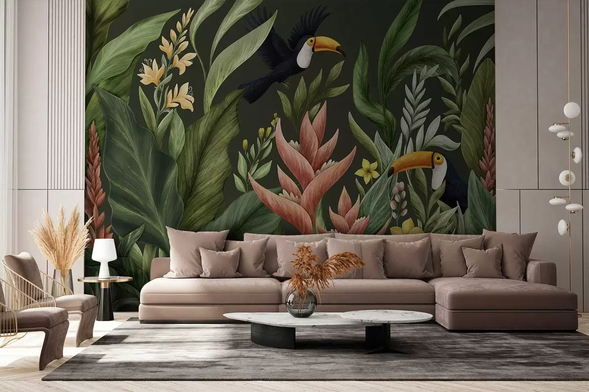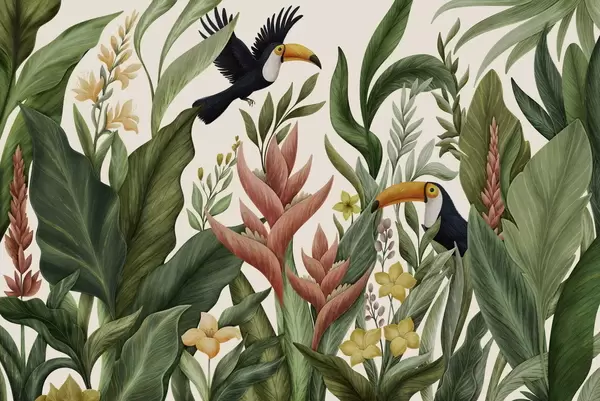 Fotomurales Plantas tropicales y aves de pico grande sobre fondo claro Nr. w05088