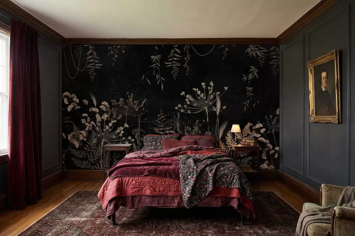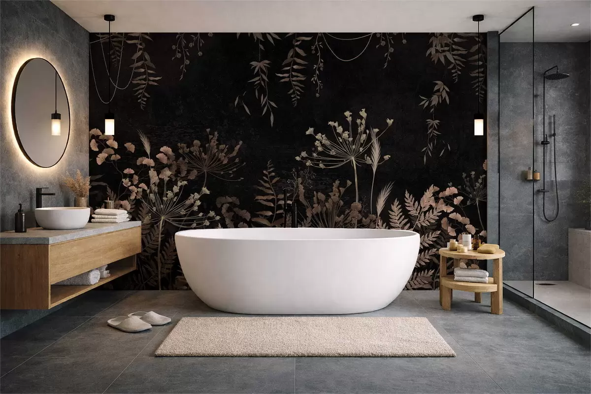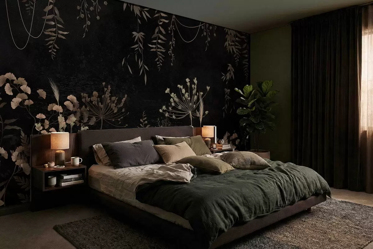 Fotomurales Diseño botánico oscuro con flores y hojas. Nr. w05092