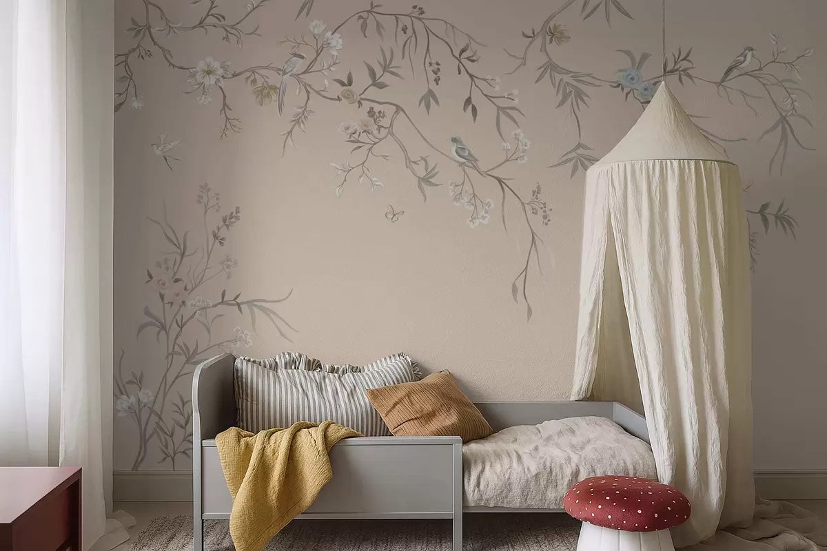 Fotomurales Ramas florales con pájaros sobre un fondo beige cálido Nr. w05127v1