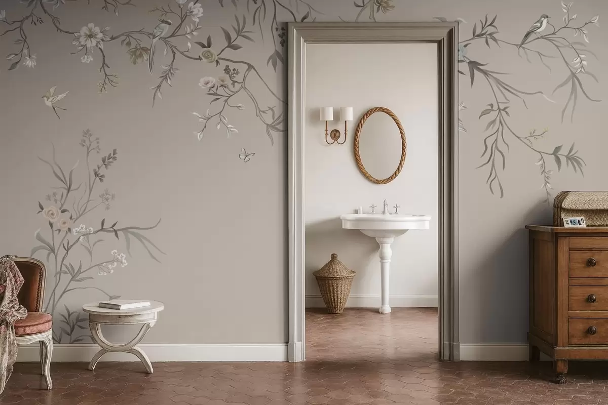 Fotomurales Adorno floral con pájaros sobre fondo neutro Nr. w05127v3