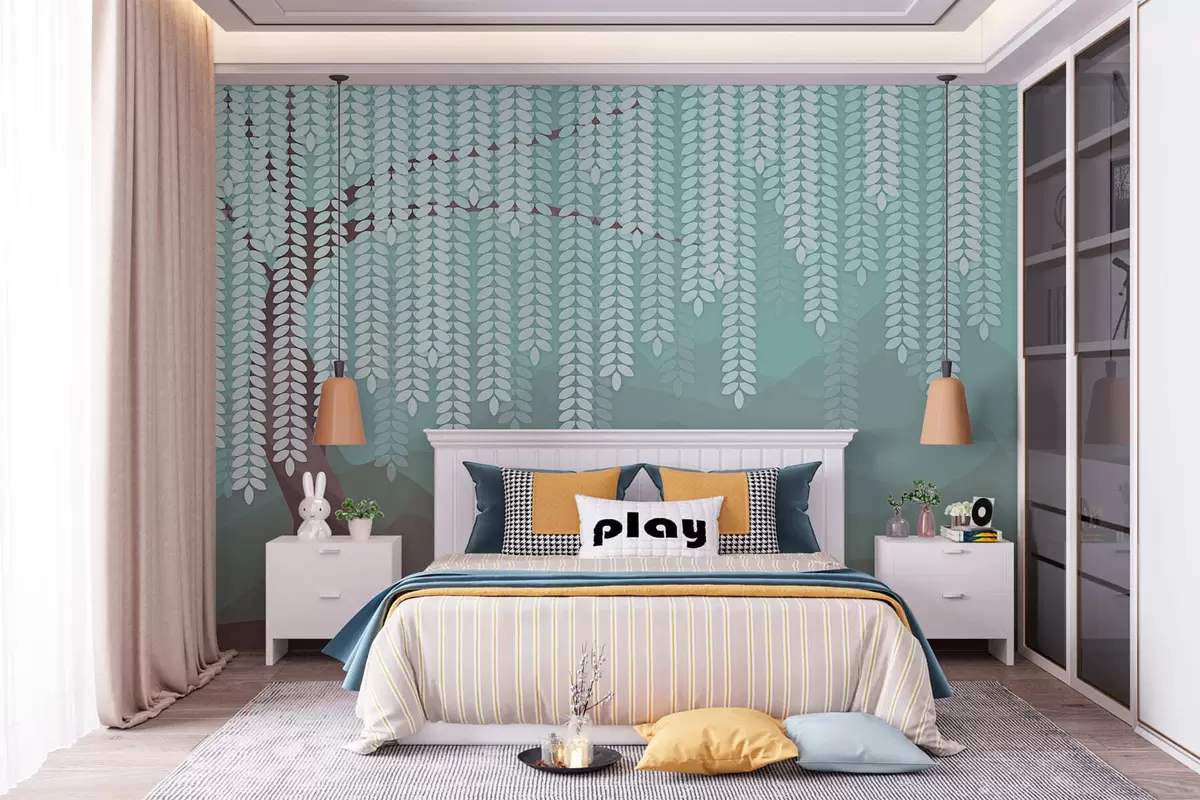 Fotomurales Árbol de sauce estilizado con hojas colgantes sobre un fondo de montañas minimalistas en tonos chocolate y turquesa. Nr. w05232v1