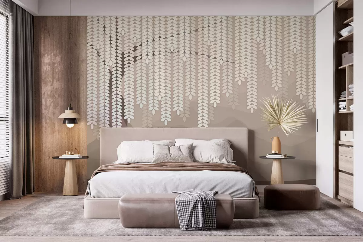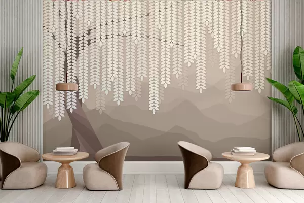Fotomurales Sauce estilizado con hojas colgantes sobre un fondo de montañas minimalistas en tonos café. Nr. w05232v2