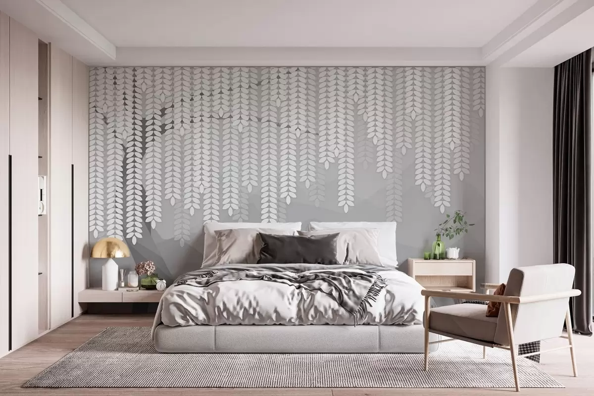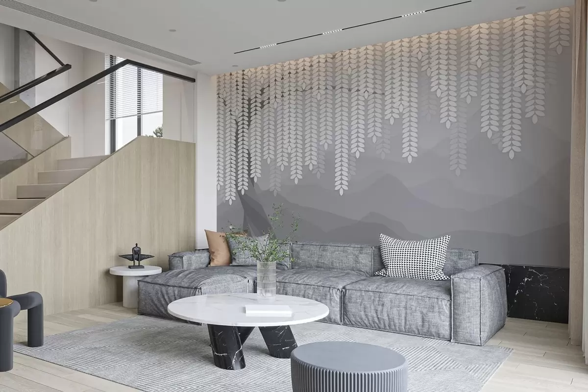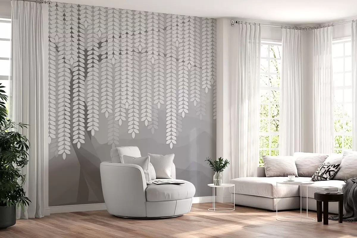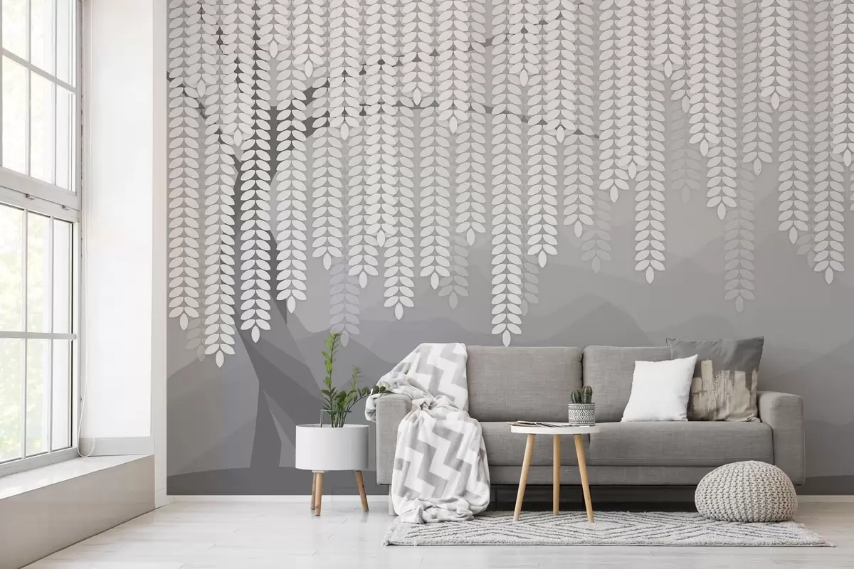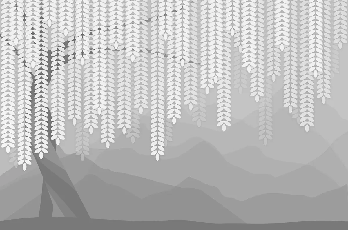 Fotomurales Sauce estilizado con hojas colgantes sobre un fondo de montañas minimalistas en tonos grises. Nr. w05232v3
