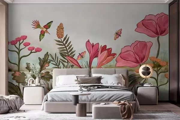 Fotomurales Flores brillantes con pájaros y mariposas Nr. w05321